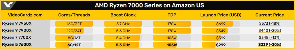 Сильнее всех дешевеет 6-ядерный Ryzen 5 5600X – входной билет в платформу AM5. Прямо сейчас на Amazon с учётом всех скидок он стоит $240 – на 20% меньше того, что просили за 5600X всего пару месяцев назад. Представители серии Ryzen 9 подешевели сопоставимо, а вот Ryzen 7 7700X меньше других. На старте он оценивался в $400, сейчас в $350.