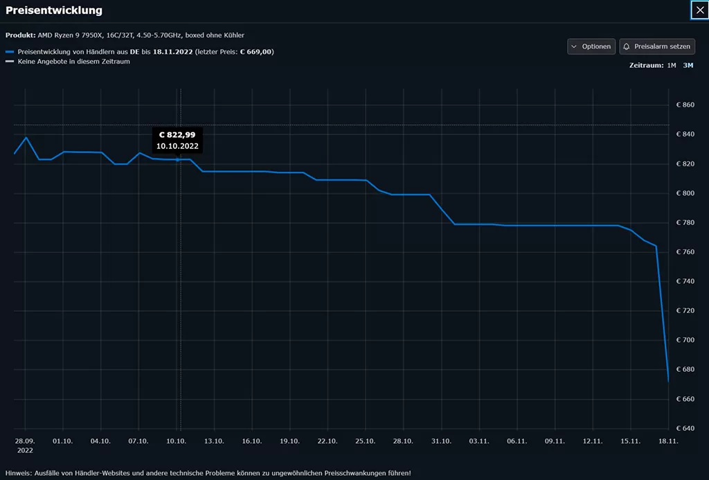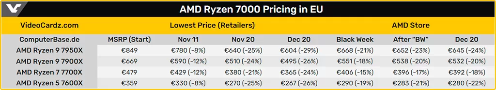 В Европе в процентном соотношении цены снизились ещё сильнее – до -29%. В среднем AMD Ryzen 7000 сейчас продаются на 24% дешевле, чем на старте. Однако, на европейские цены повлияло укрепление курса евро к доллару.
