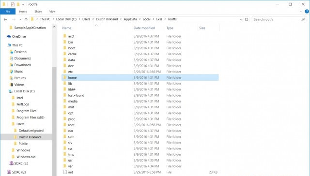 Все логические диски, вроде C:, монтируются для чтения и записи в директории /mnt, то есть /mnt/c, /mnt/d и т.д. И наоборот, файловая система Ubuntu доступна через «Проводник» в C:\Users\Kirkland\AppData\Local\Lxss\rootfs\.