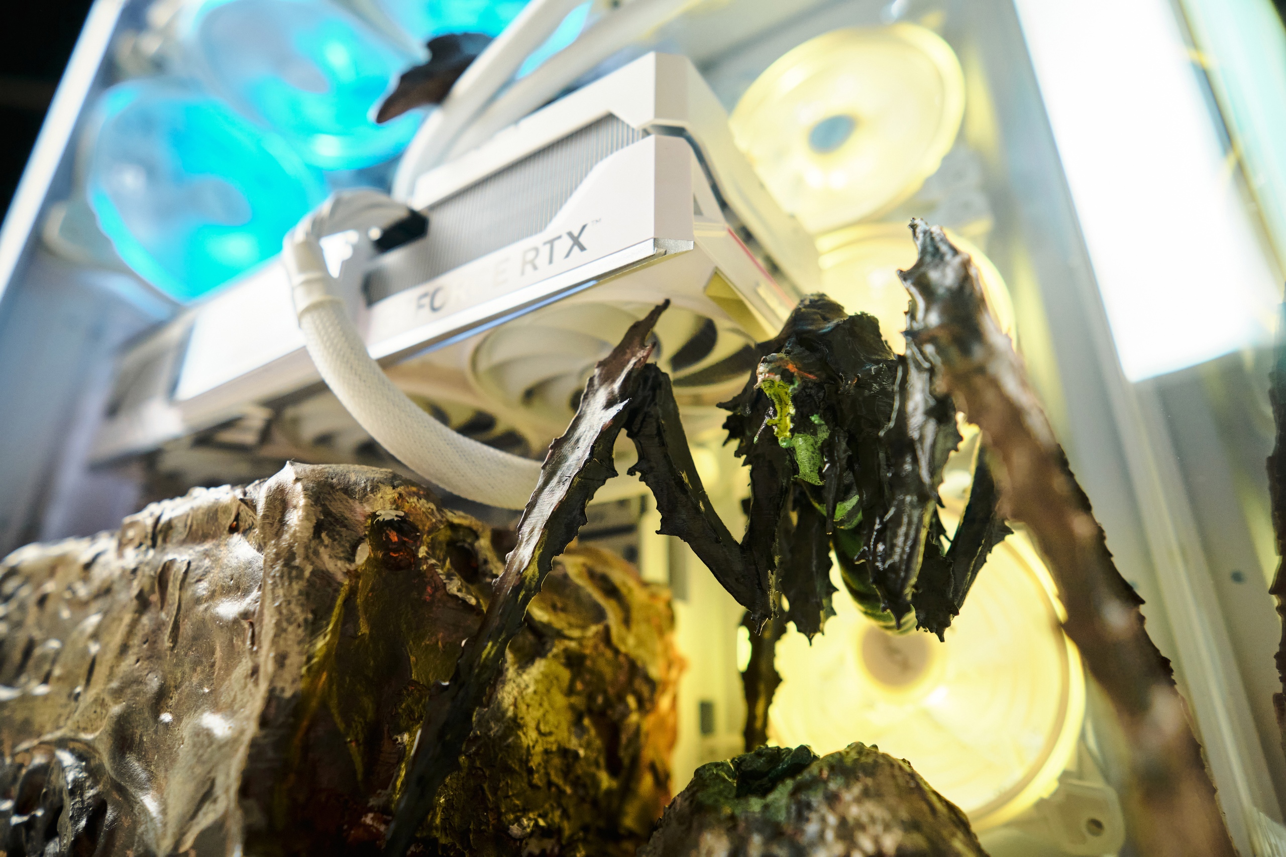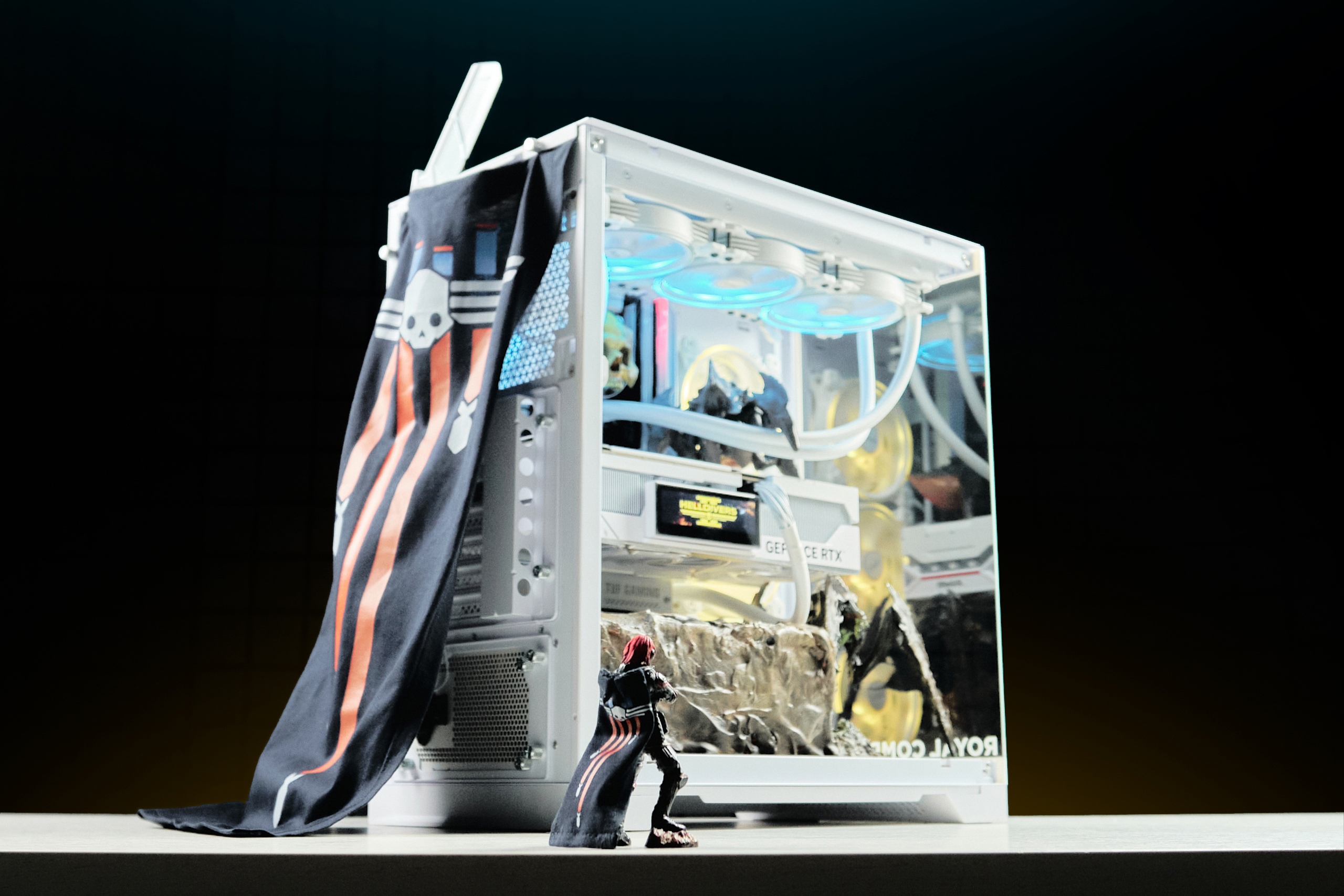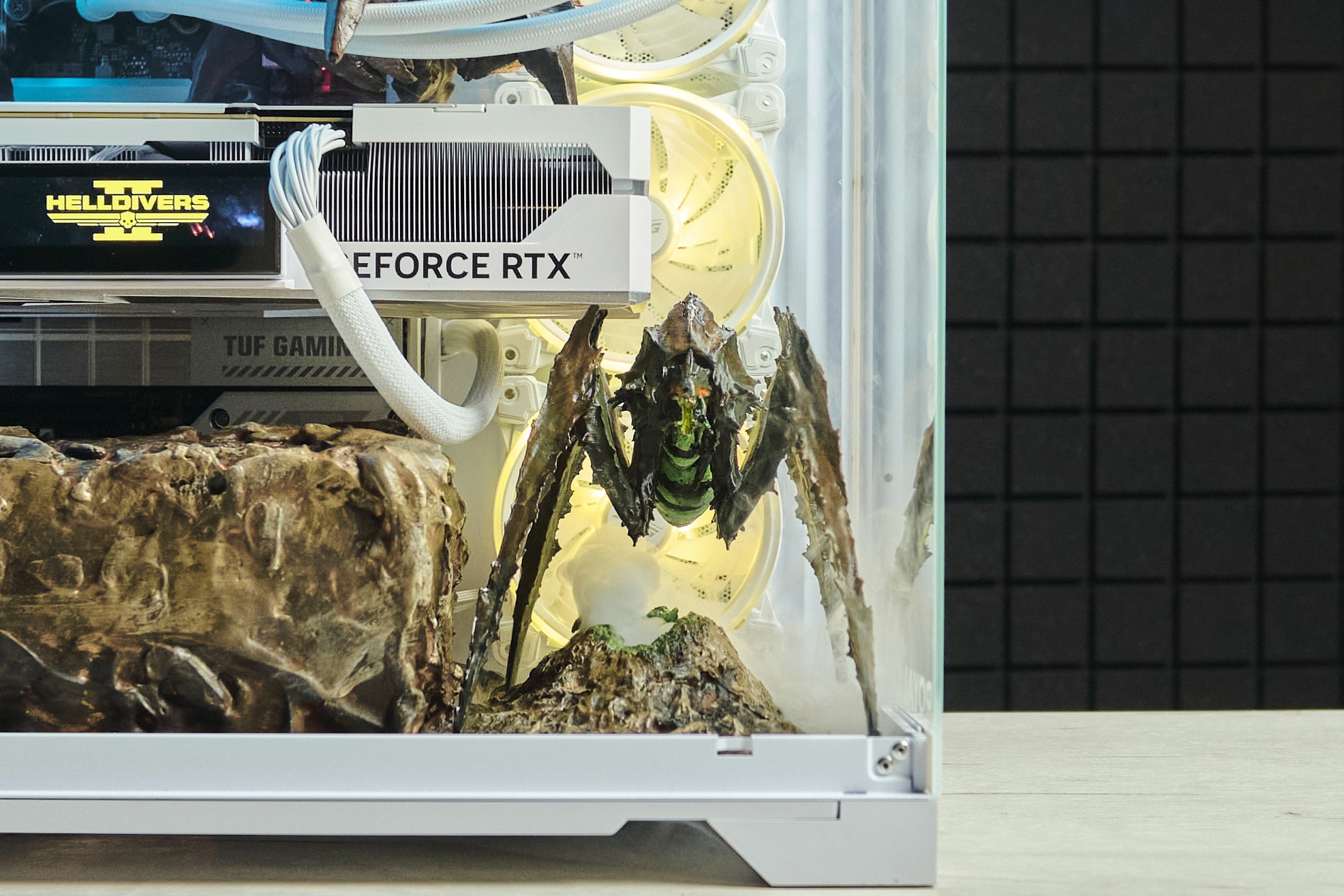 Собрали ПК в стилистике одной из нашумевших игр 2024 года – HellDivers 2. Помимо визуального рестайлинга ПК превратили в настоящую боевую диораму поместив внутри корпуса гнездо жуков, скопированное из игрового мира.