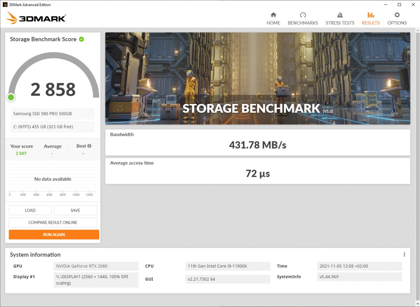 Тест дает оценку производительности 3DMark Storage Benchmark. Как обычно в 3DMark, более высокий балл означает лучшую производительность.