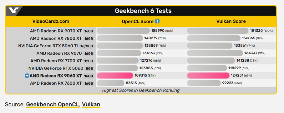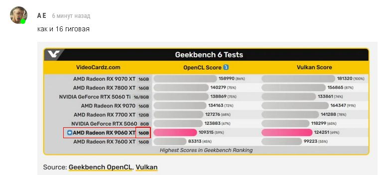 Судя по опубликованным материалам, тестируемый образец Radeon RX 9060 XT оснащен 16 ГБ видеопамяти GDDR6. В популярном тестовом пакете 3DMark Time Spy карта смогла набрать 17 069 баллов в графическом тесте, что ставит ее производительность на уровень актуальной модели RX 7700 XT. Тестирование проводилось с использованием драйвера версии 25.6.1.