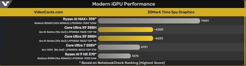 В базе данных бенчмарка 3DMark Time Spy были замечены результаты тестирования флагманского мобильного процессора Core Ultra X9 388H, относящегося к новому поколению Panther Lake. Интегрированное графическое ядро на архитектуре Xe3 с 12 ядрами смогло набрать до 6300 баллов в графическом тесте при использовании памяти LPDDR5X-9600.