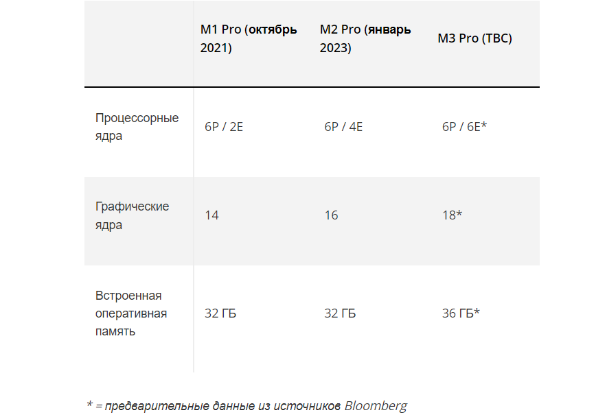 Основываясь на своих внутренних источниках, Марк Гурман из информационного издания Bloomberg заявил, что новый процессор Apple M3 Pro получит 12 ядер центрального процессора, 18 графических ядер и 36 ГБ встроенной оперативной памяти. Утверждается, что чип M3 также станет первым чипом серии Apple Silicon M, который будут производить на технологии 3 нм.