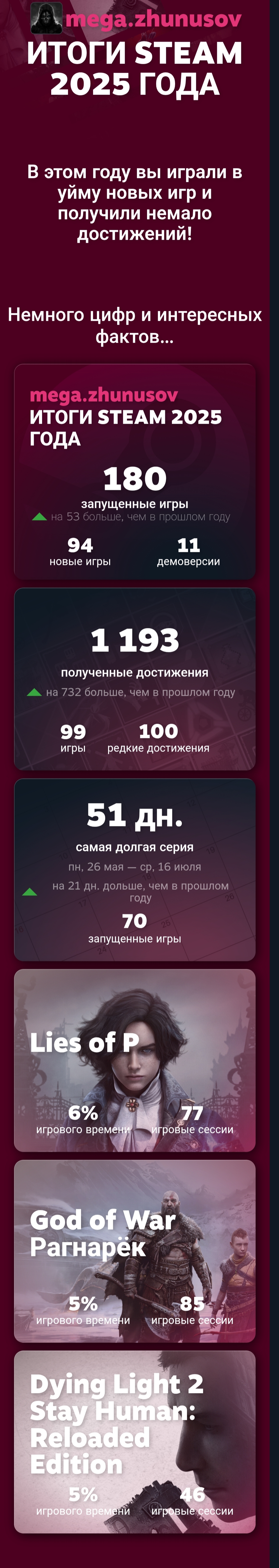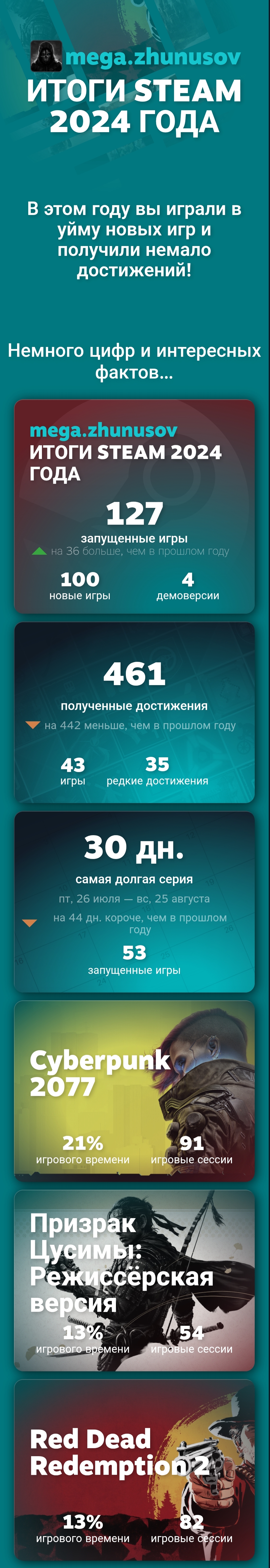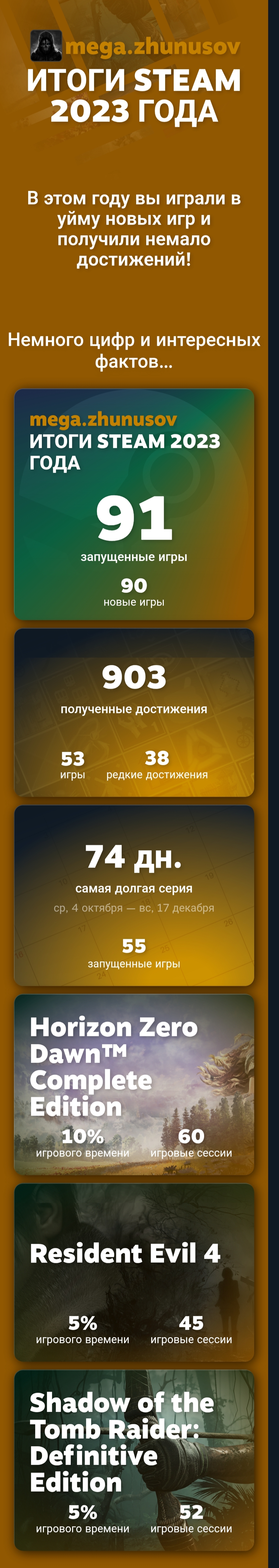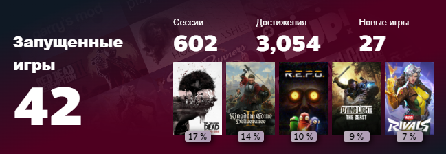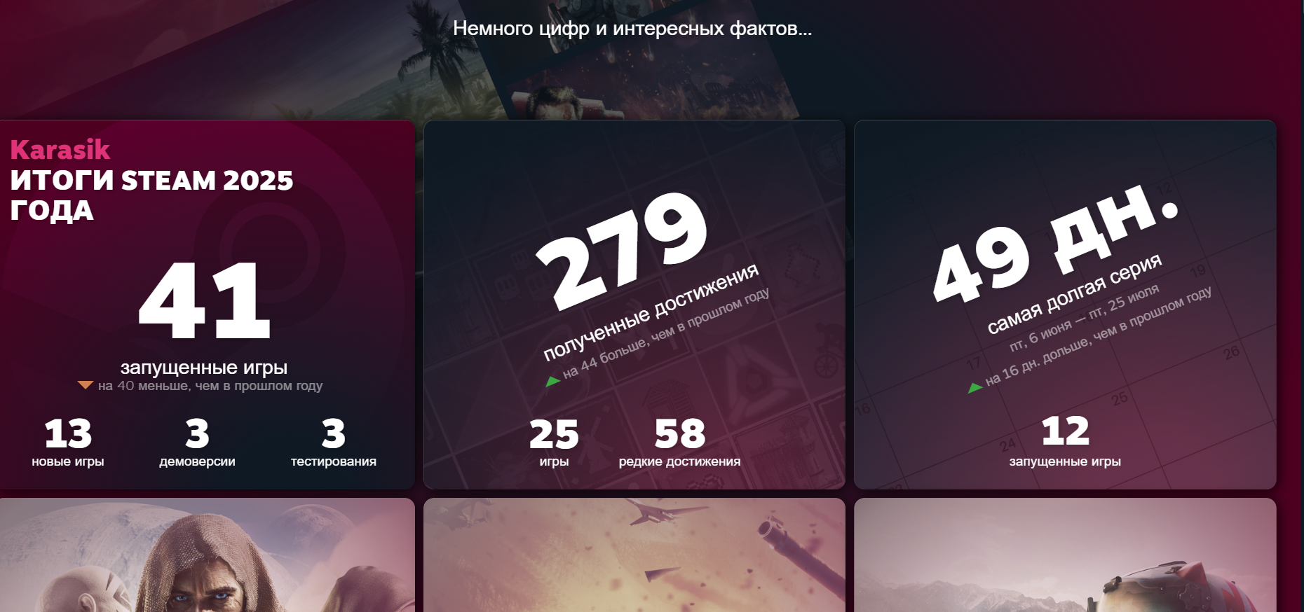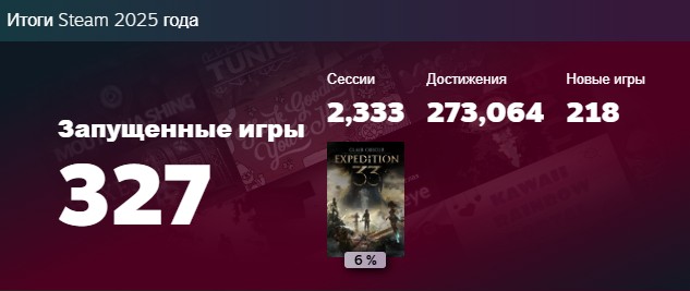 Хороший продуктивный год. Непонятно только, для чего Вальве эти итоги подводит за две недели до НГ. У них слепая зона в 17 дней, а ведь много людей покупает желаемые проекты на зимней распродаже и проходит их как раз в это время, но в итогах они не отображаются.