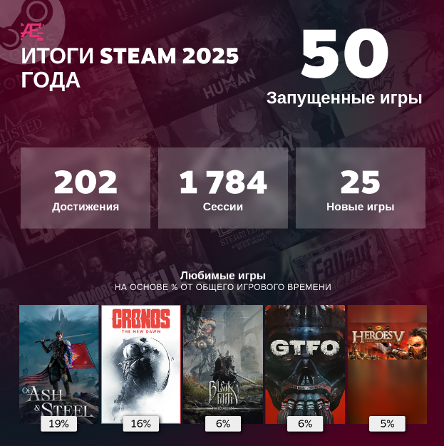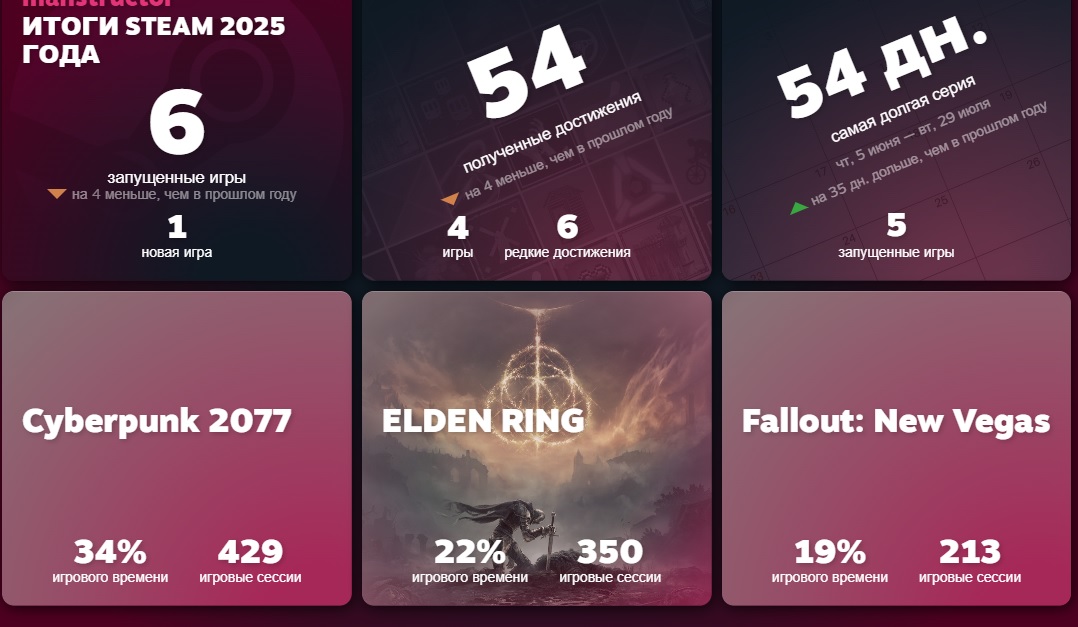 Valve запустила традиционные личные итоги года в Steam. Пользователи могут посмотреть подробную статистику за 2025-й: сколько времени они провели в играх, какие жанры и проекты стали самыми популярными, а также другие игровые привычки.
