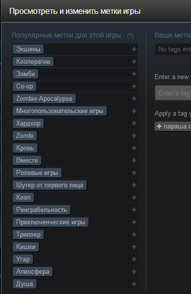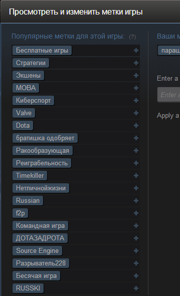 Всё уже замусорено шутниками и просто идиотами, цепляющими ко всем играм метки вроде "Not Half-Life 3" или "Разрыватель228", то есть, по факту, Стим был превращён во второй в Last.fm. Для того, чтобы вы могли осознать масштабы катастрофы, просто приведу списки тегов для Доты 2 и Left 4 Dead 2.