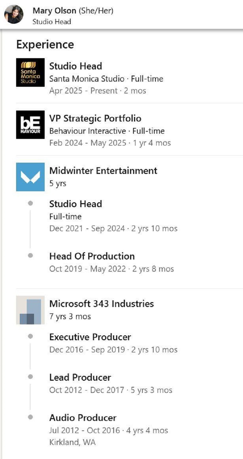 Студия Santa Monica, ответственная за франшизу God of War, получила нового руководителя. После того, как в январе студию покинула Юми Янг, получив должность в игровом подразделении Netflix, ее возглавит Мэри Олсон, ветеран индустрии с почти 30-летним стажем. Свою карьеру Олсон начала в корпорации Microsoft в 90-х годах в качестве аудиодизайнера. Впоследствии она успела поработать в таких студиях, как Zipper Interactive и 343 Industries, где была старшим продюсером, а затем исполнительным директором в проектах Halo.