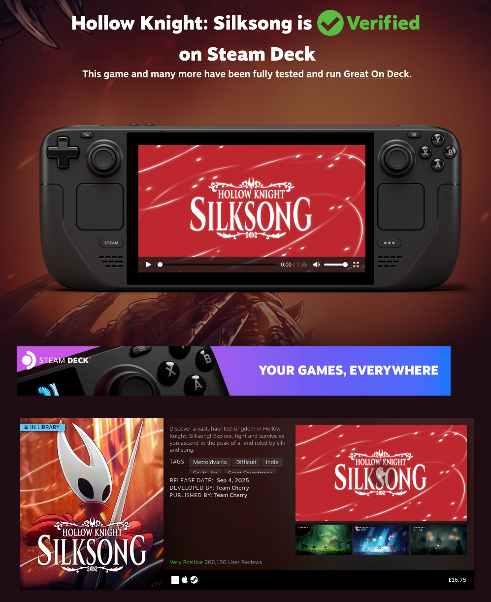 Хотя подобные страницы существуют уже некоторое время, примерно с 2023 года, до сих пор на них не было прямых ссылок в интерфейсе Steam. В основном их распространением занимались сами разработчики. Открыть такую страницу можно по прямой ссылке вида https://store.steampowered.com/verified/APPID подставив идентификатор нужной игры, но это работает только для проектов, получивших статус полностью совместимо.