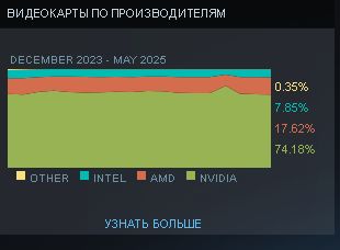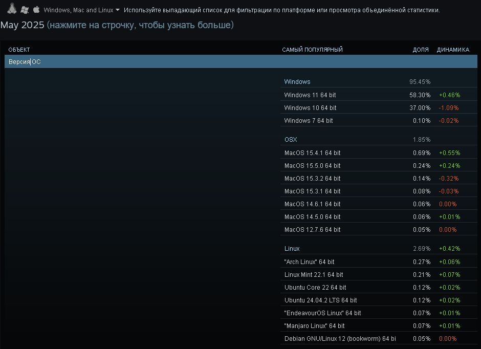Valve опубликовала свежую статистику по оборудованию пользователей Steam по итогам мая 2025 года. Компания регулярно проводит опросы, чтобы определить, какие комплектующие наиболее популярны среди геймеров.