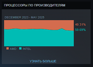 А ему то чего. У интела 59,69 у АМД 40,31 по процентам в процессорах для всех трех основных ОС. Тем более насколько я понимаю это с учетом Юникс систем. Тоесть те же стим деки. Данные по виндовс системе в моем комменте указаны. Просто в Юникс системах лидерует АМД с долей 68.77% у Интела там 31.22%. Причем Интелу удалось отвоевать 1.08% а АМД потеряла 1.09% за месяц. Ну да так оно и есть Юникс