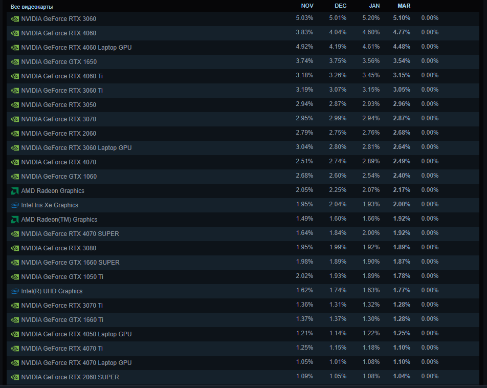 Среди видеокарт в апреле неожиданный лидер — ноутбучная NVIDIA RTX 4060. Ее доля выросла на 0,48% и составила по итогам месяца 4,80%. На втором месте с небольшим отставанием расположилась RTX 3060 — 4,57%.