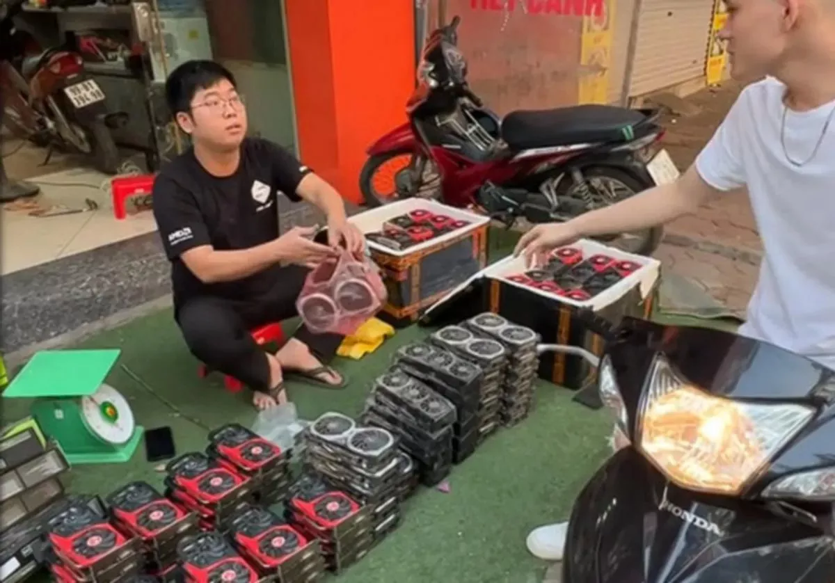 Ле Тхань (Lê Thành) опубликовал на своей странице в Facebook фотографии, где он напоминает уличного торговца, продающего фрукты и овощи, но вместо яблок - горы видеокарт. Они сложены друг на друга, некоторые в коробках, некоторые без них. Рядом с Тхань сидит старого образца мятно-зеленый набор продуктовых весов.