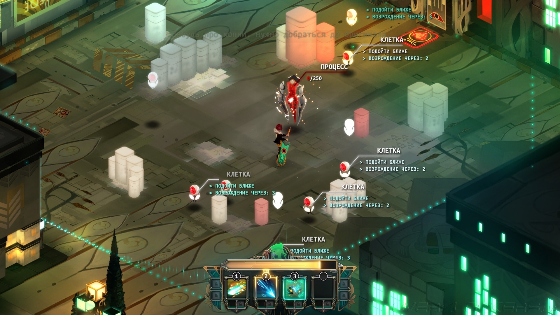 Тем не менее Ruiner обладает своими уникальными чертами. Во-первых, игра выполнена в изометрии. Во-вторых, уровни более просторные и включают в себя закоулки с разными бонусами. Кроме того, главного героя подстерегают ловушки, например, раскалённые сопла, плюющиеся пламенем, или турели.