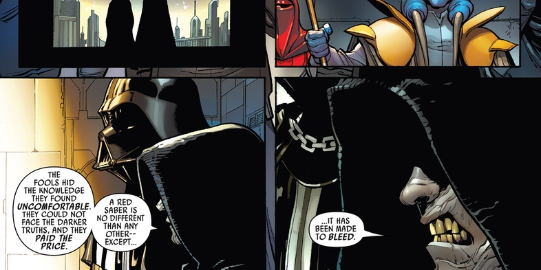 На этой неделе вышел первый номер новой серии комиксов Darth Vader. Его сюжет разворачивается почти сразу после событий третьего эпизода, и в нём рассказано о «превращении» Энакина Скайуокера в Дарта Вейдера. Император Палпатин рассказывает Вейдеру о том, что кайбер-кристаллы обладают собственным сознанием. Когда кристалл ощущает гнев и злость своего носителя, то начинает… кровоточить. Да-да, Палпатин так и говорит.