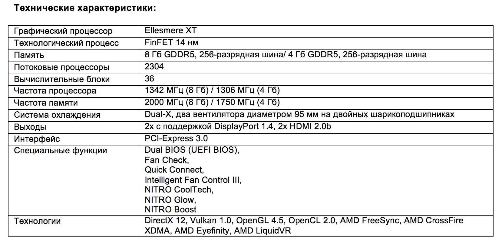 Игровая серия SAPPHIRE NITRO+ Radeon™ RX 480 спроектирована для обеспечения высокого качества игрового процесса в разрешении 1440p. В видеокартах используются (применяются) графические процессоры архитектуры Graphics Core Next 4 поколения с усовершенствованной геометрической подсистемой, увеличенным кэшем и поддержкой асинхронных шейдеров. 2304 потоковых процессора работают на частоте 1342 МГц. Старшая видеокарта оснащена памятью GDDR5 объёмом 8 Гб с полноскоростным доступом, работающей на частоте 2000 МГц и использующей 256-разрядную шину. Версия NITRO+ RX 480 4 Гб поставляется с частотой ядра 1306 МГц, объем памяти GDDR5 с тактовой частотой 1750 МГц составляет 4 Гб.