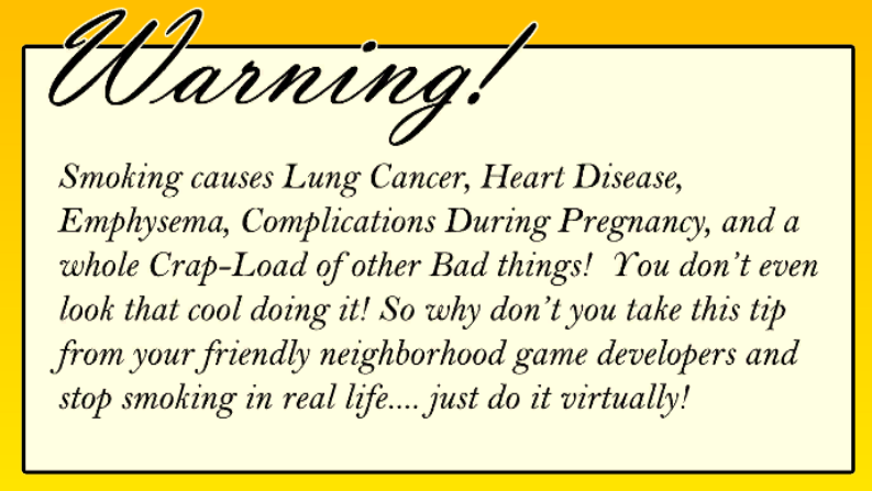 «Внимание! Курение вызывает рак легких, болезни сердца, эмфизему, осложнения во время беременности и хренову тучу других Плохих штук! Курение даже не делает тебя крутым! Так почему бы не воспользоваться этим советом от доброжелательных разработчиков: бросай курить в реальной жизни... и делай это виртуально!».