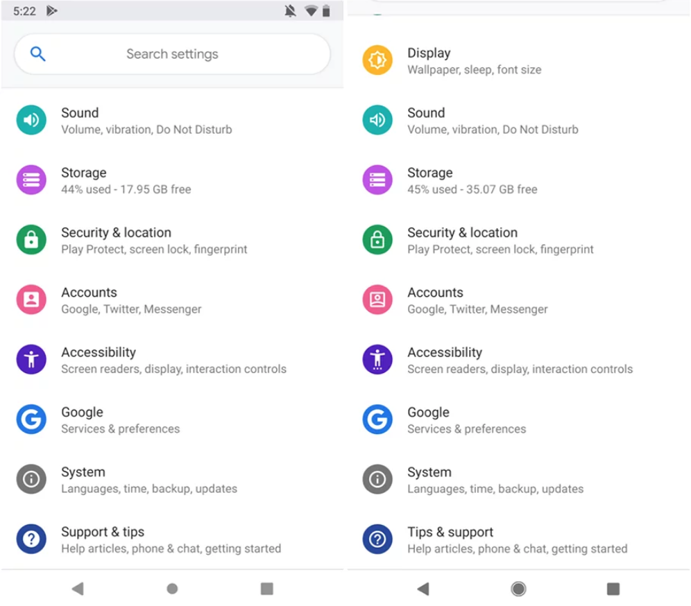 Пожалуй, самым масштабным изменением в Android P DP4 стал новый стиль иконок — теперь они не заполнены краской, а состоят только из контуров. Это отражается на всех знаках (статус-бара, иконок в настройках) и даже на кнопке «Назад». В галерее выше запечатлены изменения в формате «было (DP3) — стало (DP4)».
