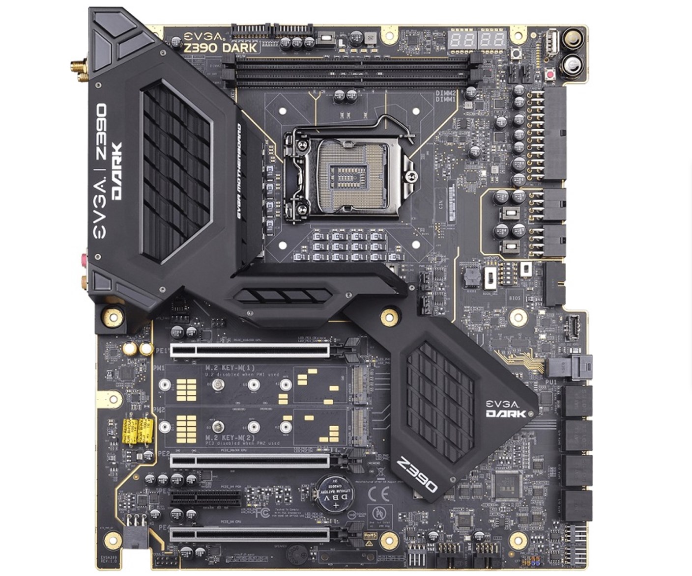 На фоне решений конкурентов EVGA Z390 Dark выделяется необычной компоновкой: слоты под оперативную память расположены вверху, а 8-контактные разъёмы питания процессора находятся рядом с 24-контактным ATX. Всё это призвано облегчить использование платы на открытом стенде.