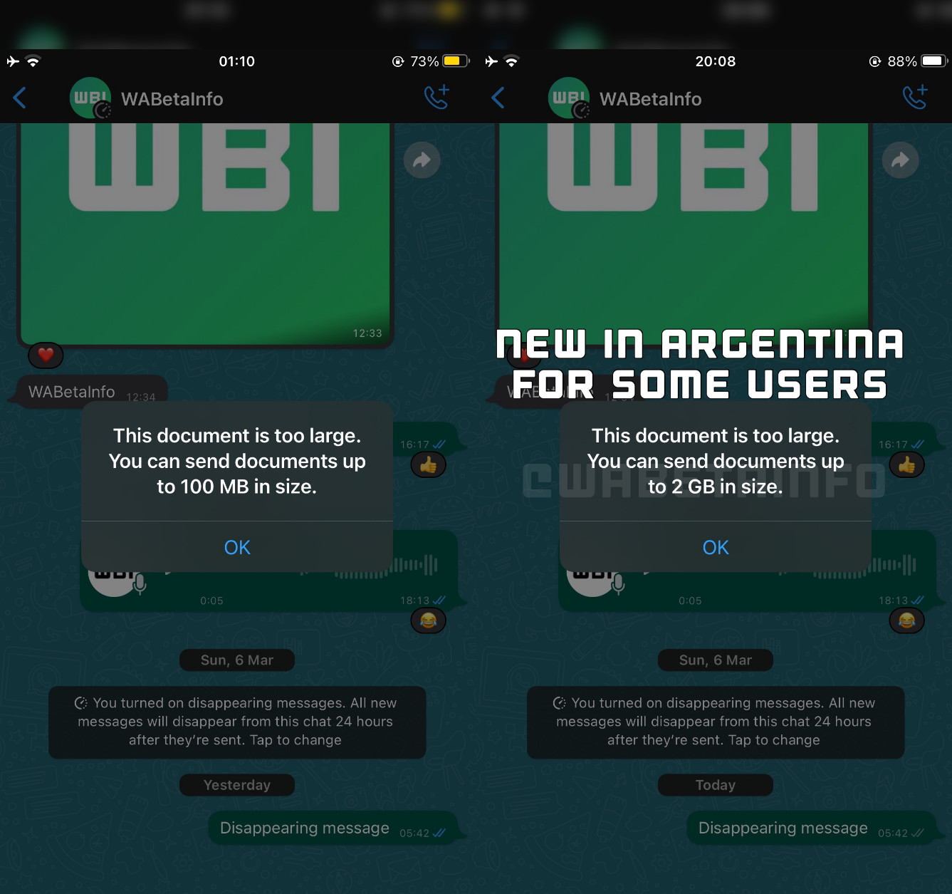 Согласно скриншотам, сделанным в версии мессенджера для iOS, новый лимит размера файла в 2 ГБ уже доступен некоторым пользователям из Аргентины. Более того, новинка появилась и у людей, использующих бета-версию WhatsApp для Android.