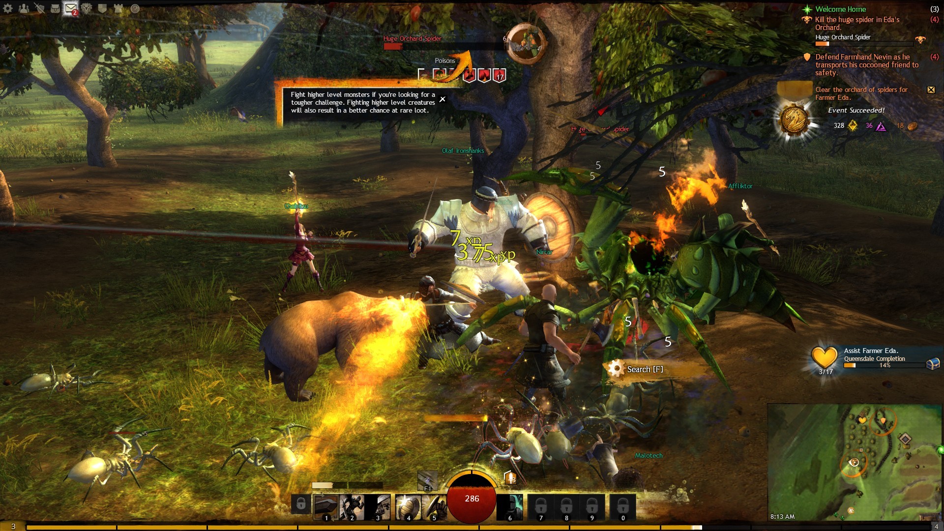 Guild Wars 2 — нетипичная MMORPG, разработчики по-своему сделали многие традиционные элементы жанра. Например, оригинально выполняются квесты. В других играх нужно идти к персонажу, брать у него задание, а потом топать за тридевять земель на территорию, где это поручение следует выполнять. Компания Arena.net упразднила ненужную беготню: ступили на локацию — сразу появляется суть вашей миссии. Затем начинаете выполнять квест, и полоса прогресса заполняется.