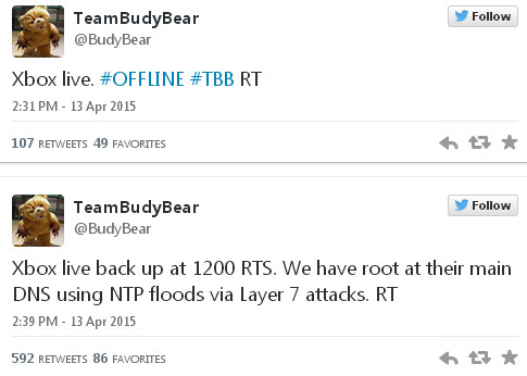 TeamBudyBear, представитель хакерской группы Greyhat, заявил в твиттере, что их группа берет на себя ответственность за падение сервиса. Они получили доступ к главному DNS Xbox Live, используя NTP-флуд с помощью атак 7 слоя. Группа утверждает, что услуги Xbox Live вновь будут доступны после 17:00 по МСК.