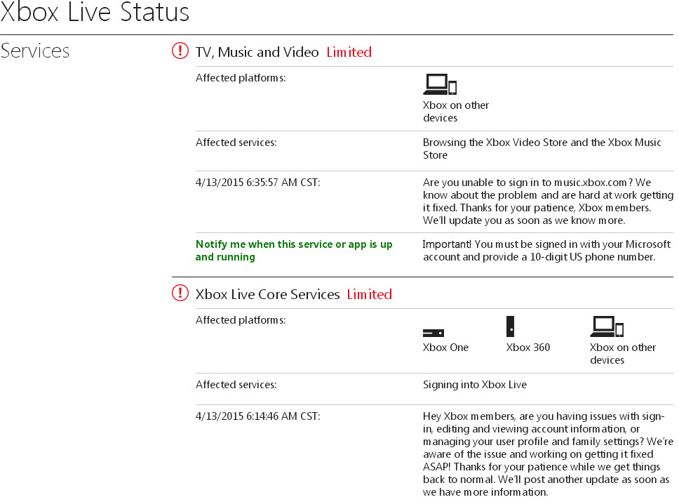 Microsoft, тем временем, обновила страницу состояния Xbox Live, указывая, что большая часть услуг испытывают проблемы. Это относится как к Xbox One, так и Xbox 360. Все основные услуги сейчас ограничены.