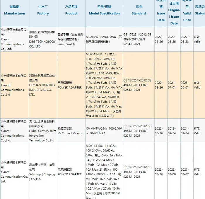 Зарядной адаптер Xiaomi MDY-13-EU ранее встречался в различных сертификатах и сегодня стало известно, что пройдена новая сертификация 3C для MDY-13-EU со скоростью зарядки 210 Вт.