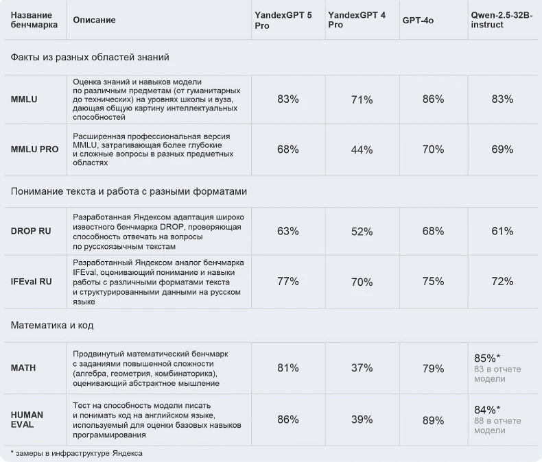По результатам слепого тестирования, проведенного Яндексом, YandexGPT 5 Pro сопоставима с GPT-4o и в 64% случаев обходит китайскую модель Qwen2.5 (версия Qwen-2.5-32b-Instruct) в задачах, типичных для сервисов Яндекса. Международные тесты и их адаптации для русского языка показывают, что новая модель близка к GPT-4o, а в некоторых сценариях превосходит ее. По сравнению с Qwen2.5, YandexGPT 5 Pro лучше справляется с фактическими вопросами и соблюдением формата, но немного уступает в математике.