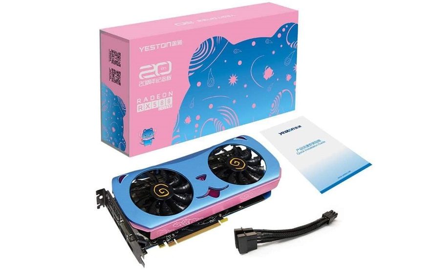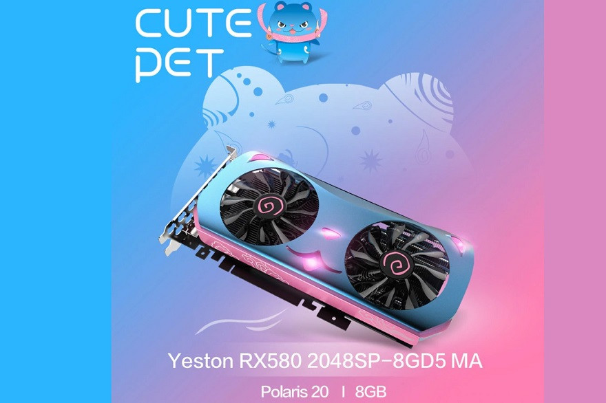 Yeston представили дополнение к своей линейке видеокарт AMD в виде «CUTE PET» RX 580. Название подразумевает именно то, для чего предназначена эта карта: красочная, подростковая тема в голубых и розовых тонах с вырезами на печатной плате, которые напоминают ... хорошо ... милый питомец. В вырезах для глаз, ушей и рта "CUTE PET" есть элементы RGB, глаза представляют собой запутанные спирали, построенные из конструкции с двумя вентиляторами, есть синяя пластина с вырезами в виде облаков...