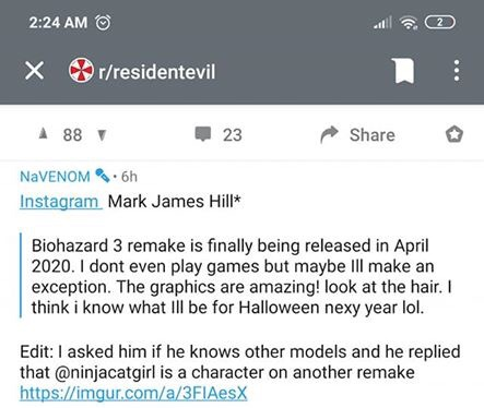 Все началось с того, что игроки поинтересовались, знает ли Хилл других актеров, задействованных в ремейке Resident Evil 3. В ответ он дал ссылку на профиль живущей в Токио шведской модели, публикующей в Instagram снимки под ником ninjacatgirl, и написал, что она "стала персонажем в другом ремейке".