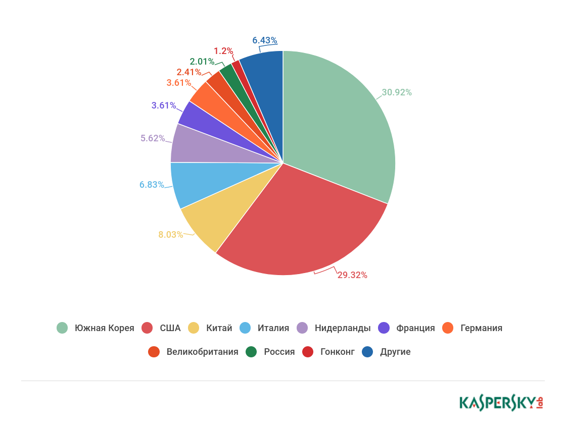 В январе–марте нынешнего года были зафиксированы атаки в 79 странах. Лидерство по числу атак в прошедшем квартале сохранил Китай с долей около 60 %. На втором и третьем местах находятся соответственно США и Южная Корея с результатом около 18 % и 8 %. Россия в рейтинге находится на десятой позиции с долей менее 1 %.