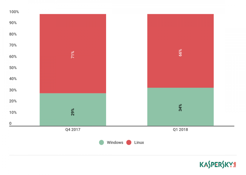 Доля Linux-ботнетов в прошедшем квартале слегка уменьшилась по сравнению с концом 2017 года — 66 % вместо 71 %. Соответственно, количество Windows-ботнетов выросло с 29 % до 34 %.