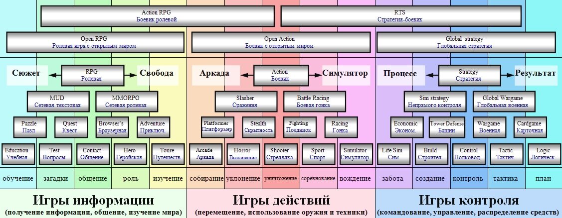 Вот одна из самых популярных схем объясняет систему жанров с точки зрения гейм-дизайна