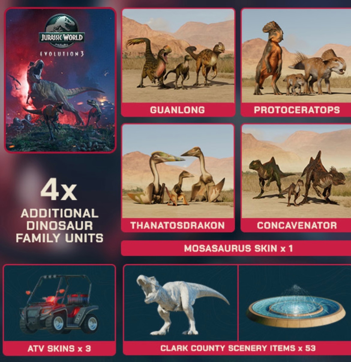В Evolution 3 вас ждёт более 80 видов динозавров и других древних животных, из которых 75 доступны для разведения и воспитания нескольких поколений. Каждый вид живёт по своим правилам: уникальные социальные потребности, поведение и взаимодействия с окружающим миром — от полуводных обитателей до птерозавров, гуляющих по суше. Гости парка смогут наблюдать, как великанские ящеры создают семьи и реагируют на окружающую среду.