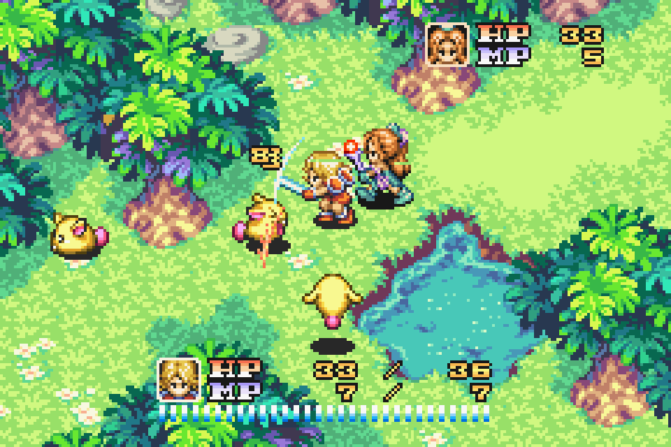 Визуально Sword of Mana одна из красивейших игр для GBA, студия Brownie Brown подошла к разработке с невероятной нежностью и уважением к серии. Дизайн уровней, боссов, сопровождающие эффекты – на высоте.