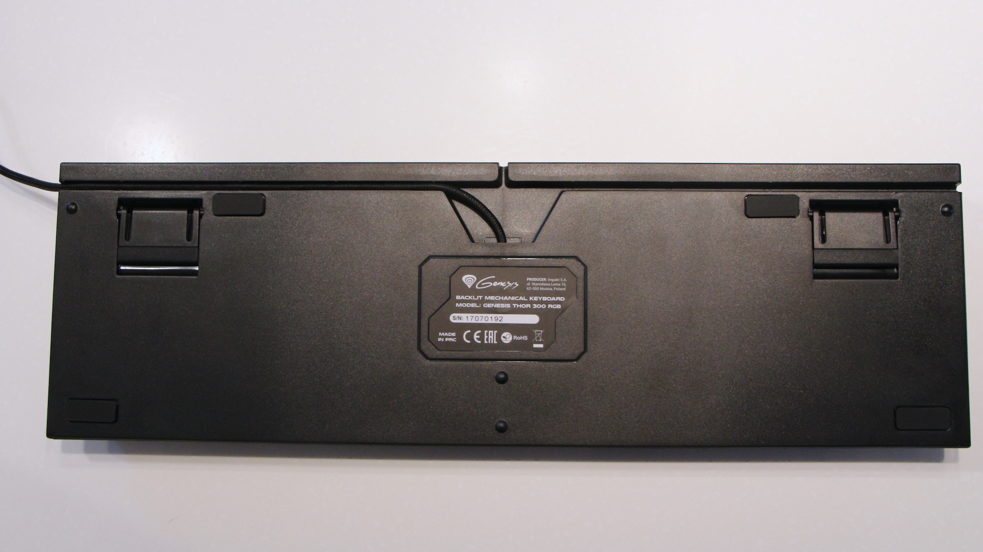 Клавиатура оборудована отщелкивающимися ножками и трехнаправленным кабель-каналом, что положительно сказывается на эргономике рабочего места. Толстый кабель дополнительно защищен тканевой оплеткой, но следует обратить внимание на его небольшую длину. Обычно клавиатуры имеют шнур от 1,8 до 2 метров, здесь всего 1,6.