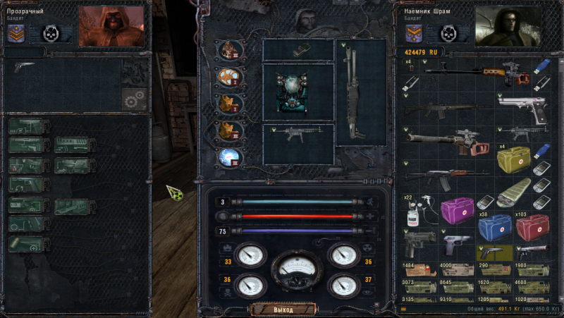 Инвентарь в данной части преобразился, исчезло поле с описанием, вместо него теперь всплывает с помощью курсора, рюкзак переместился вправо(вес расположен снизу, финансовое положение сверху над паспортными данными(аватaрка, имя и группировка в которой состоит обладатель личика на аватaрке) в остальном изменений нет) по центру мы видим, что у нас экипировано( в ячейках слева артефакты, сверху в маленькой ячейке детектор(с помощью сея ноу хау мы можем искать артефакты бегая по аномалиям подобно гаишник с aлкотестером, да, он вооружает наши глаза тем самым "вжух" благодаря которому артефакты становятся зримыми), ниже идет броня, после дополнительное оружие(пистолеты), справа основное оружие(все кроме пистолетов), ниже мы можем лицезреть наше состояние(выносливость, здоровье(кровотечение!!!), брони, пси воздействия, радиационного облучения, ожогов и ядов?(неблагоприятной кислотной среды), а так же насколько помню указывал на аномалии вон той здоровой штукой со стрелкой(не помню как называется, простите). В данной части уже можно было продвинуто апгрейдить оружие и броню. Т.е. пошла тенденция на тюнинг.