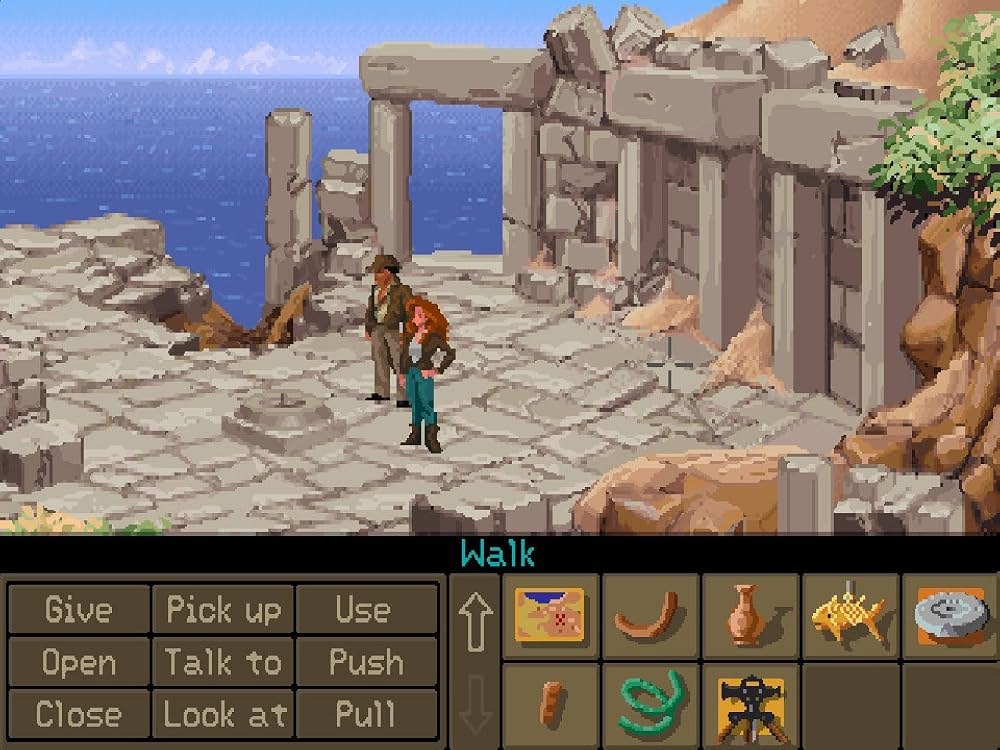 А теперь настало время великой классики. Перенесемся в 1992 год, когда студия LucasArts выпустила Indiana Jones and the Fate of Atlantis. Это не был платформер или экшен в духе других 2D-игр того времени, а великое приключение в жанре point-and-click, которое многие поклонники франшизы до сих пор считают настоящим «четвертым фильмом» об Индиане Джонсе. Те картины, которые вышли в 2008-м и 2023 годах… вспоминать не особенно хочется.