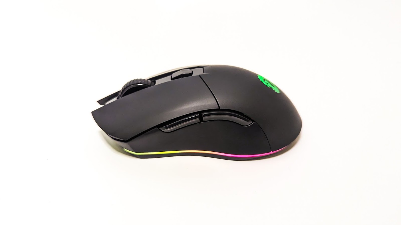 Сверху имеется стандартное колесико, над которым дополнительная кнопка для быстрой смены значения DPI или переключения профилей настройки. На нижней части можно найти переключатель режима работы мыши (Bluetooth, приемник или “выключена”, для работы по проводу).