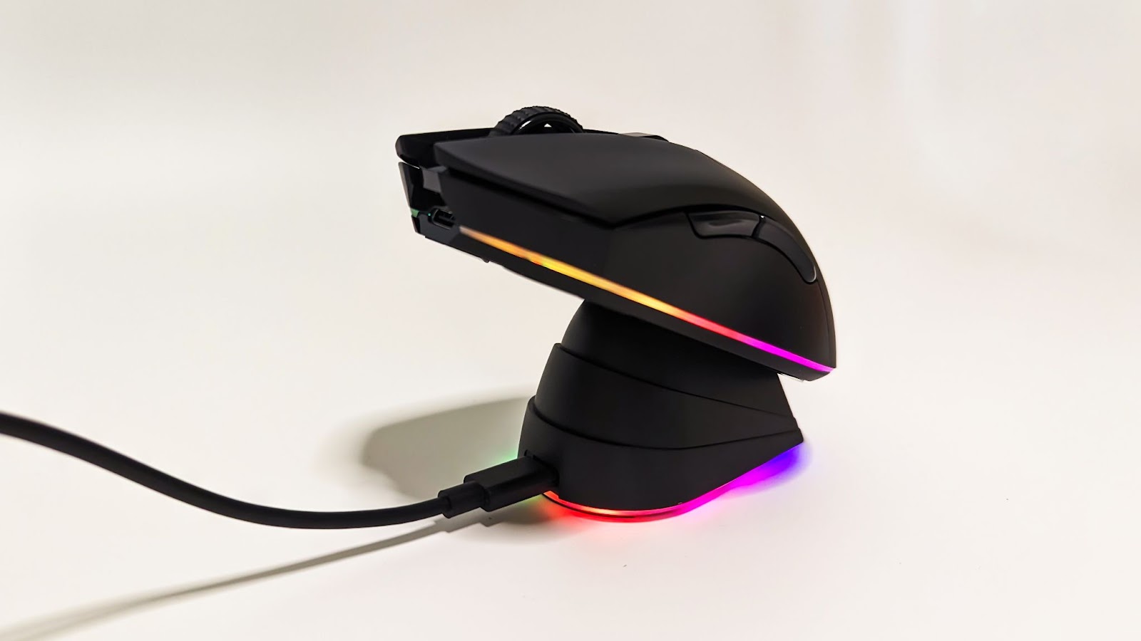 Зарядка аккумулятора происхоидт по средства размещения на специальной платформе, которая подключается к ПК комплектным кабелем (USB-A). В самой подставке никаких интересностей и сюрпризов вы не обнаружите: сочетание матового и глянцевого пластиков, цепкое основные и разъем для подключения USB-свистка. Ну и без полосы подсветки постаментик не оставили — композиция очень яркая и привлекательная.