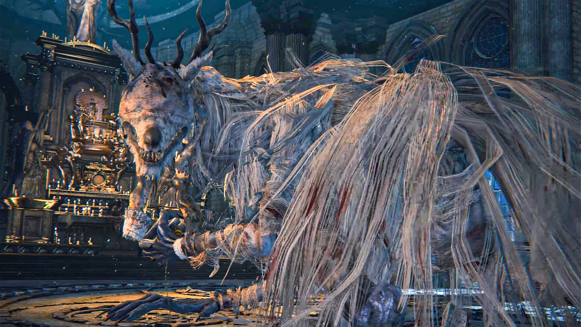 В любой игре от студии Frome Software есть как минимум один босс, который намеренно останавливает ваш прогресс и заставляет вас поднабраться как можно больше опыта и терпения, прежде чем идти с ним в бой. Викарий Амелия – это как раз-таки один из таких типов боссов. Хотя при первой встрече с Амелией такого и не скажешь. Так, при входе в зал Главного Собора мы застанем Амелию в молитве перед алтарем. Единственный намек на предстоящее сражение делает сам зал невероятно огромных размеров. А мы с вами знаем, что просто так, огромные открытые пространства Frome Software никогда не делает. И действительно, подойдя к Викарии, она превратиться в огромного зверя с длинной белой шерстью и кавайным черным носиком.