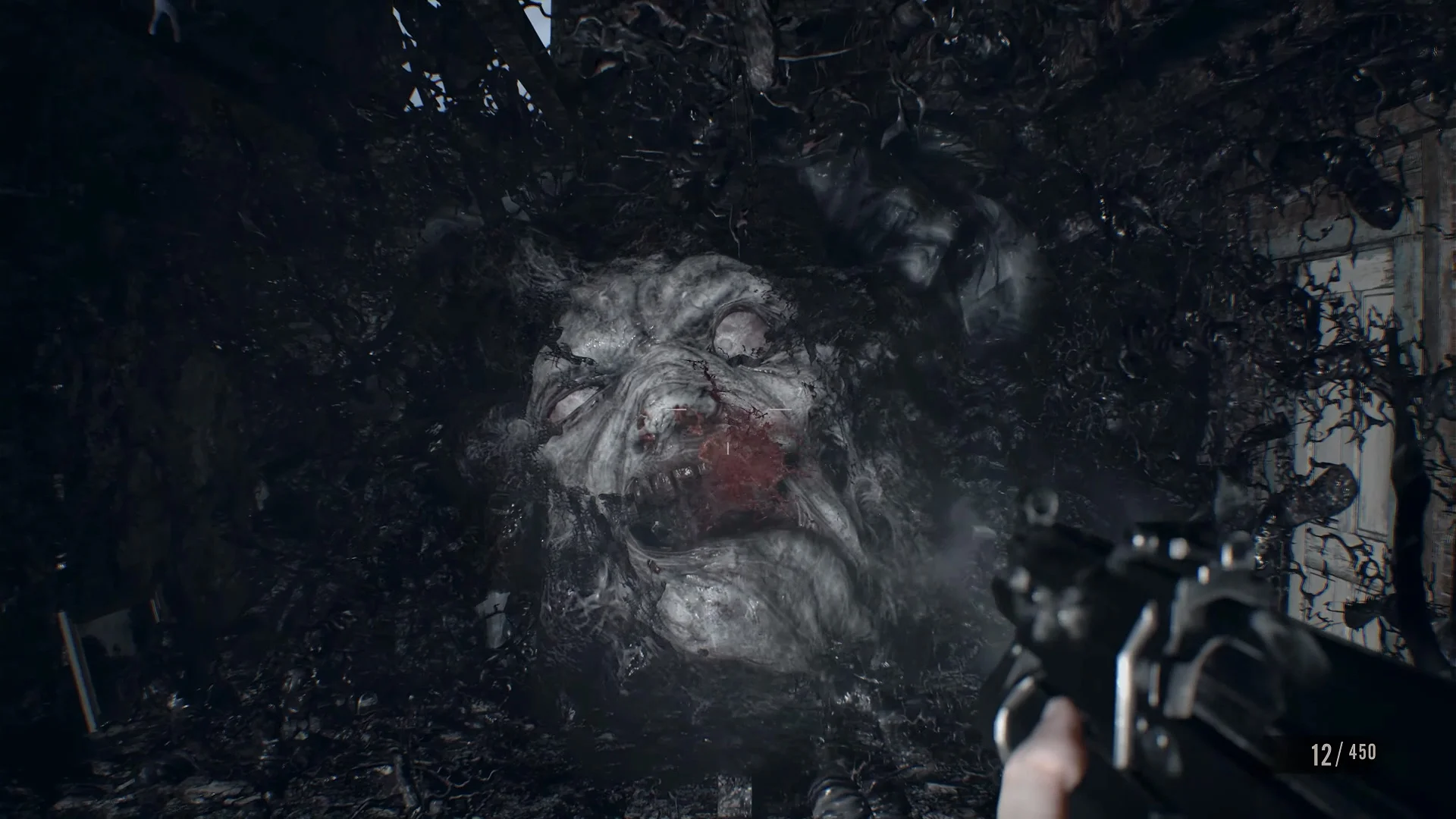 Тут мы плавно перешли ко второй причине - ее размеры. Вместо того что бы сдохнуть, Эвелина сперва буквально на наших глазах растворяется и превращается в гигантского плесневого монстра с щупальцами, на столько громадного, что Эвеилна без труда ломает дом Бейкеров, и выбрасывает Итана на улицу, где мы воочию может увидеть ее колоссальные размеры. И когда все патроны на исходе и надежды уже нет, вам по всем традициям серии Resident Evil сбрасывают ультимативное оружие против монстра, правда в этот раз не базуку, а специальное оружие против Плесени – пистолет Альберт-01. И хоть само по себе сражение с ФИНАЛЬНЫМ боссом невероятно легкое, Мутация Эвелины реально удивляла игрока, ведь никто не ожидал, что эта дряхлая старушенция превратиться в нечто подобное.