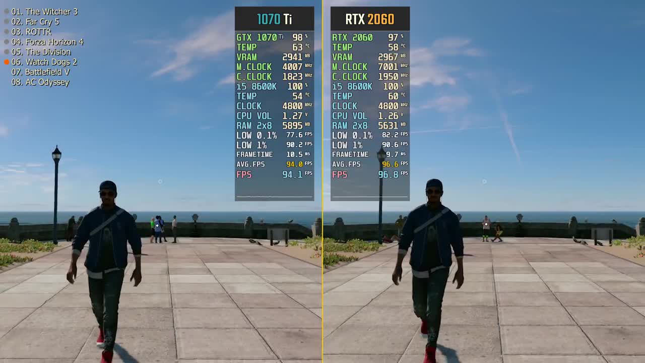 Наглядное сравнение видеокарт в разрешении 1440p можно увидеть в ролике ниже. В большинстве из игр RTX 2060 производительнее в среднем на 10%, кроме Forza Horizon 4, где она отстаёт от GTX 1070 Ti примерно на 2%.
