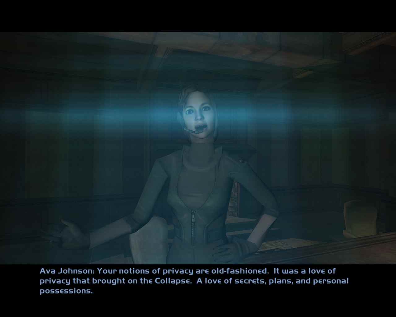 Сюжет Deus Ex раскрывается в основном через закадровые голоса, то есть диалоги между NPC и Дентоном по «инфолинк» — аугментации для общения на расстоянии. Подобное часто практикуется в играх-боевиках, поскольку позволяет рассказать историю без нарушения потока событий. Иногда между главным героем и NPC, с которыми он сталкивается, завязывается разговор, однако решения, принятые во время таких бесед, редко оказываются важными.