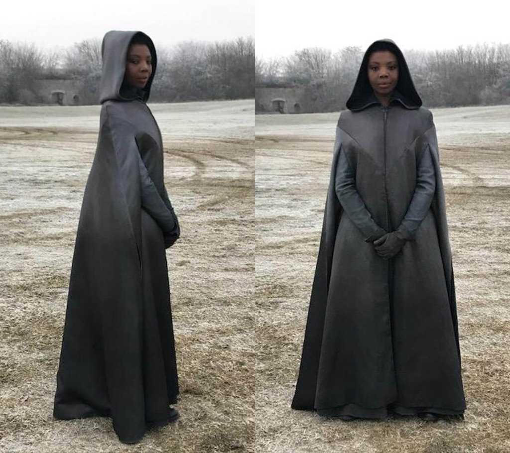 «Это был только один из тех моментов, когда я просматривал сотни образов и разных вещей, просто проводя некоторые исследования. И я наткнулся на это платье. Это было нечто среднее между боевой одеждой и древней Бриттон-Боудиккой… Одна из вещей, о которых я говорил ранее с Лорен, заключается в том, что она не хотела, чтобы это выглядело, как старый средневековый мир. Она хотела чего-то другого, по понятной причине: это не наш мир — это параллельный мир. Очевидно, что это должна была быть готика, в виде готической истории, но мы решили смешать ее с современной высокой модой, которую Лорен особенно любила. Платье Йеннифер — это что-то вроде боевого костюма высокой моды… И на моем столе случайно оказались образцы черных шелковых канатов, о применении которых я еще даже не думал. А потом я просто взглянул на них и сказал: «Мы могли бы сделать что-то с помощью этого.»