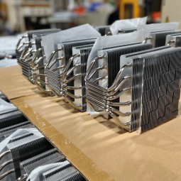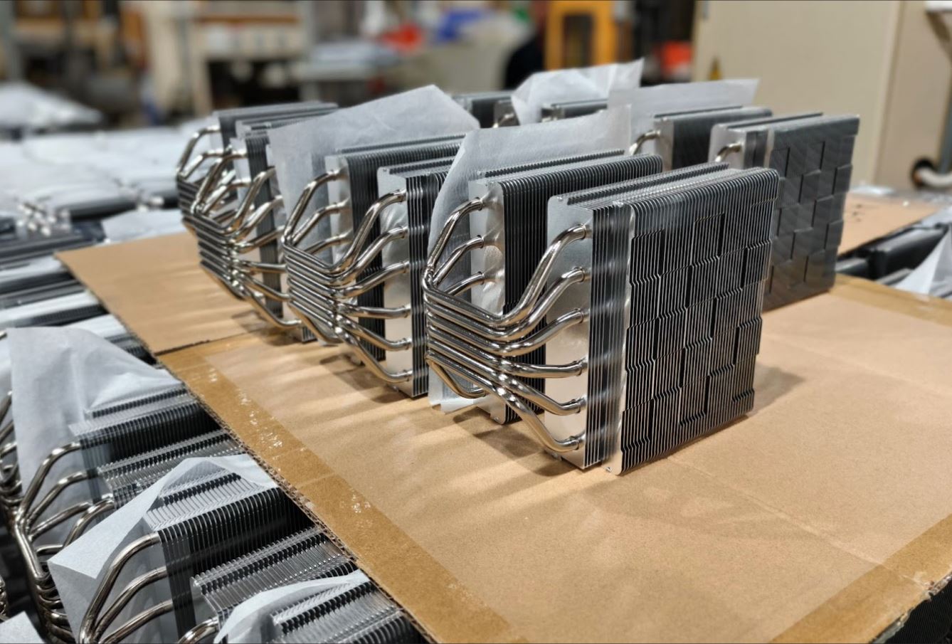 Далее — цех сборки воздушных систем охлаждения. На этом этапе медным трубкам придают форму и наполняют их водой, затем совмещают с алюминиевыми пластинами радиатора. К конструкции добавляют медное основание, которое будет снимать тепло с крышки процессора. Часть деталей создаётся на больших 3D-принтерах с такой скоростью, что оператор постоянно в работе.