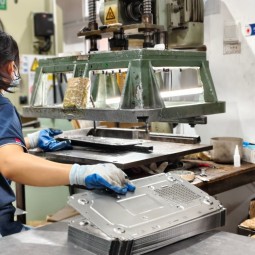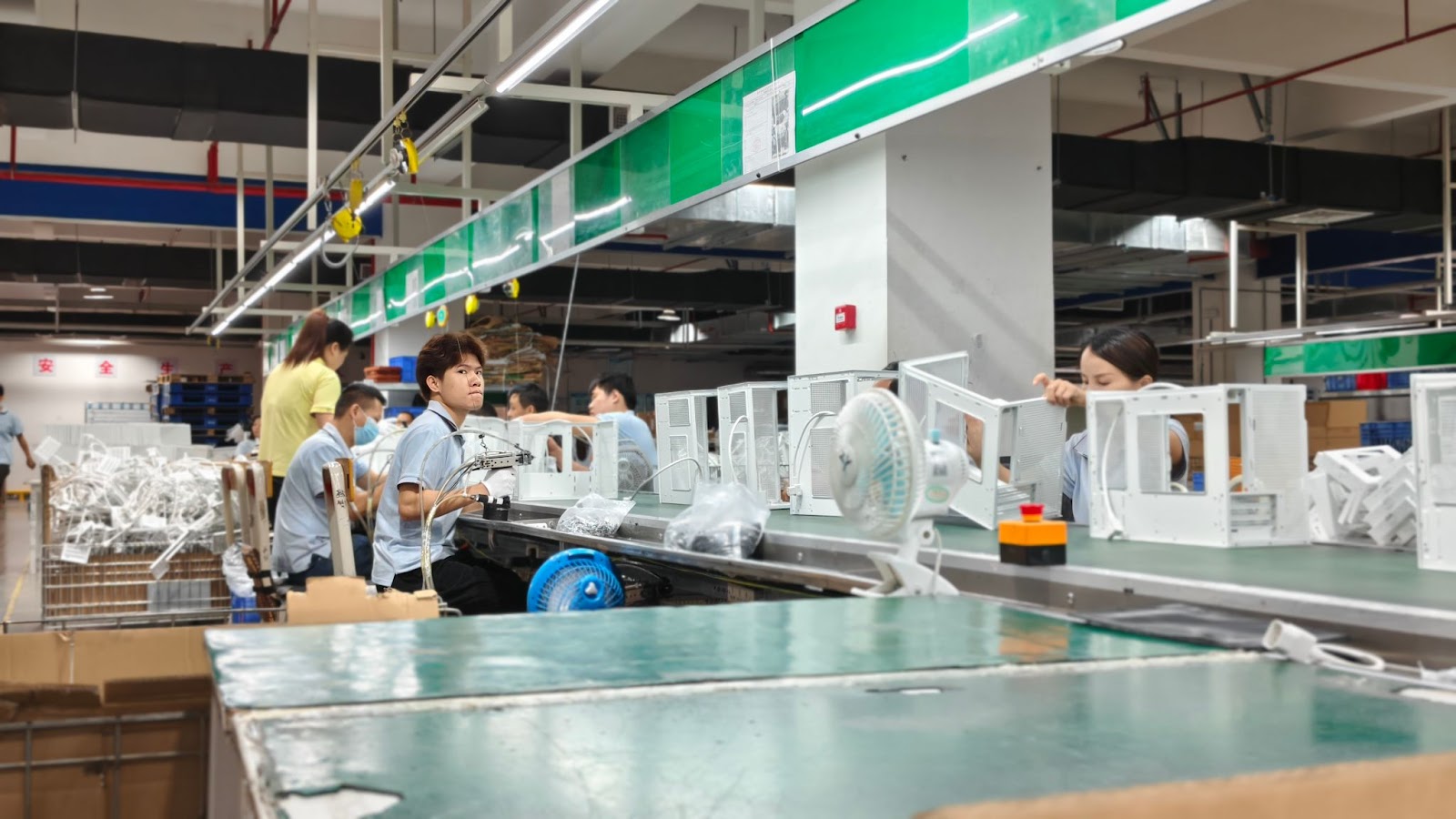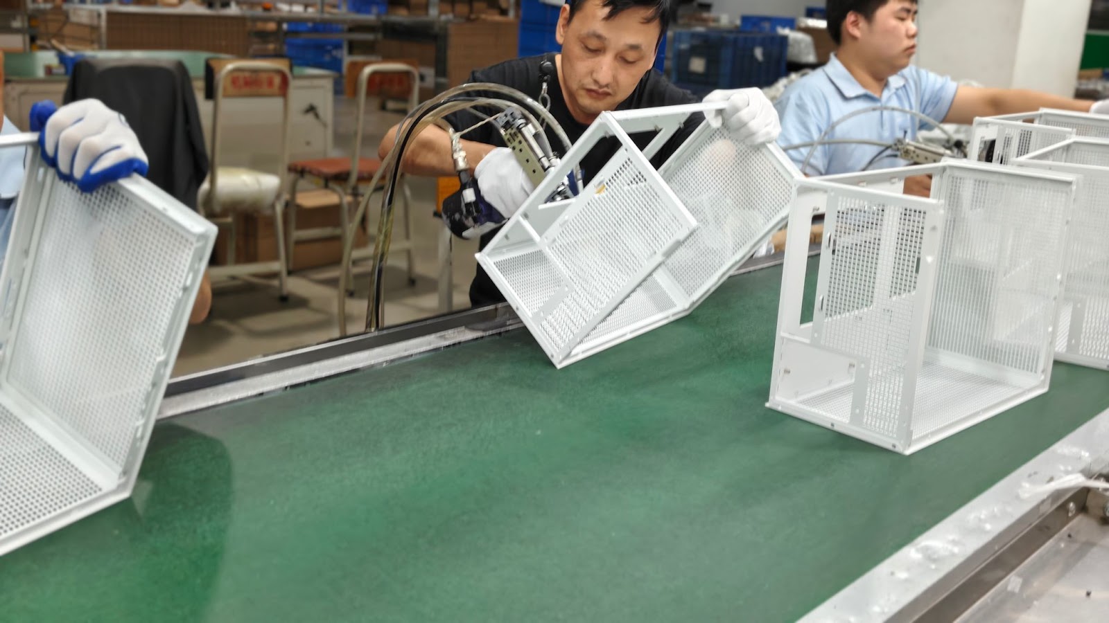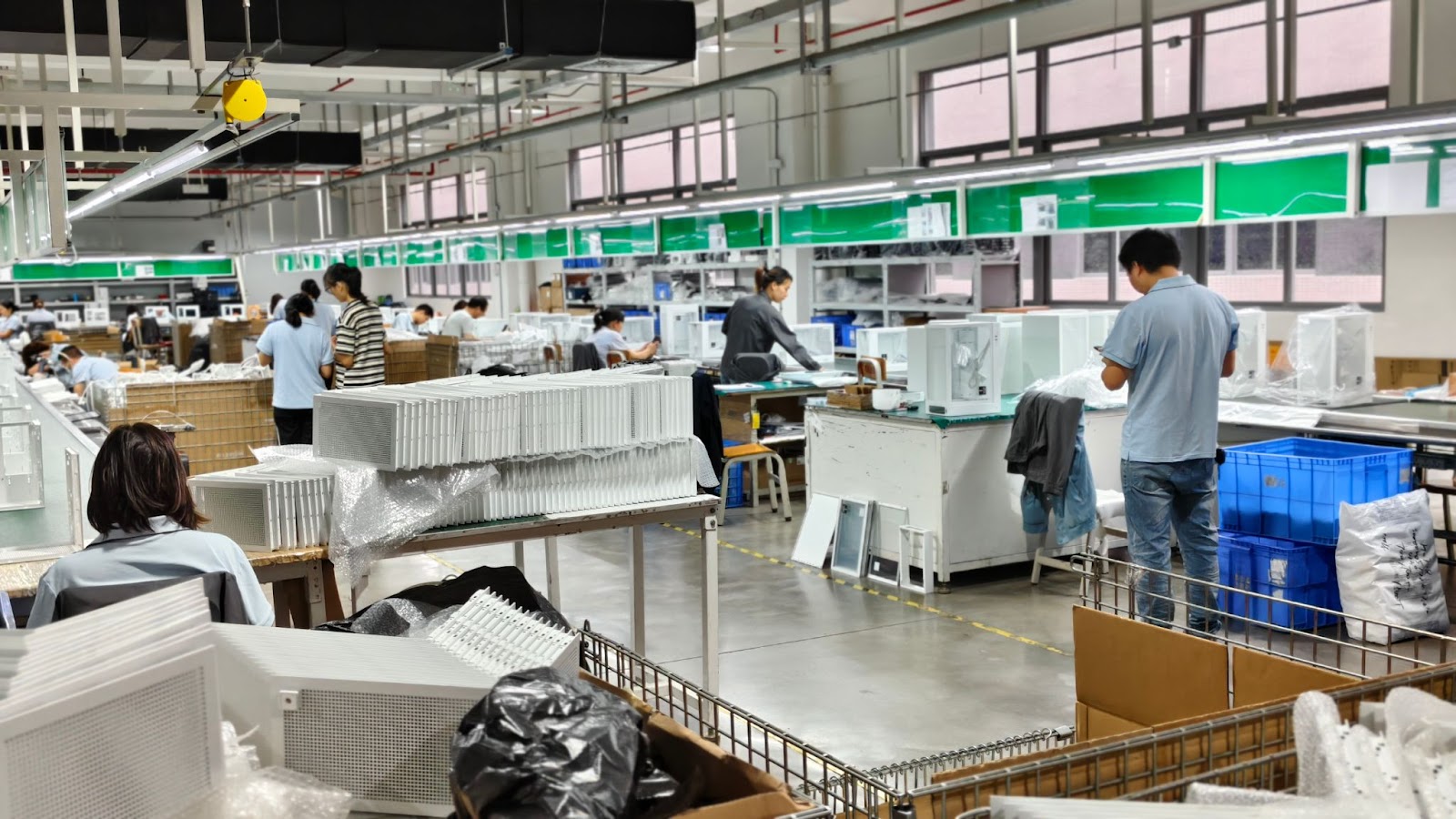 Отдельный цех занимается выпуском корпусов, например, модели CH170. Два конвейера работают параллельно: один собирает чёрные версии, другой — белые. Роботы нарезают листы металла и подают их на линию, где сотрудники вручную крепят панели, устанавливают кнопки и разъёмы передней панели. На конвейере есть точка тестирования — корпус подключают, чтобы проверить подачу питания.