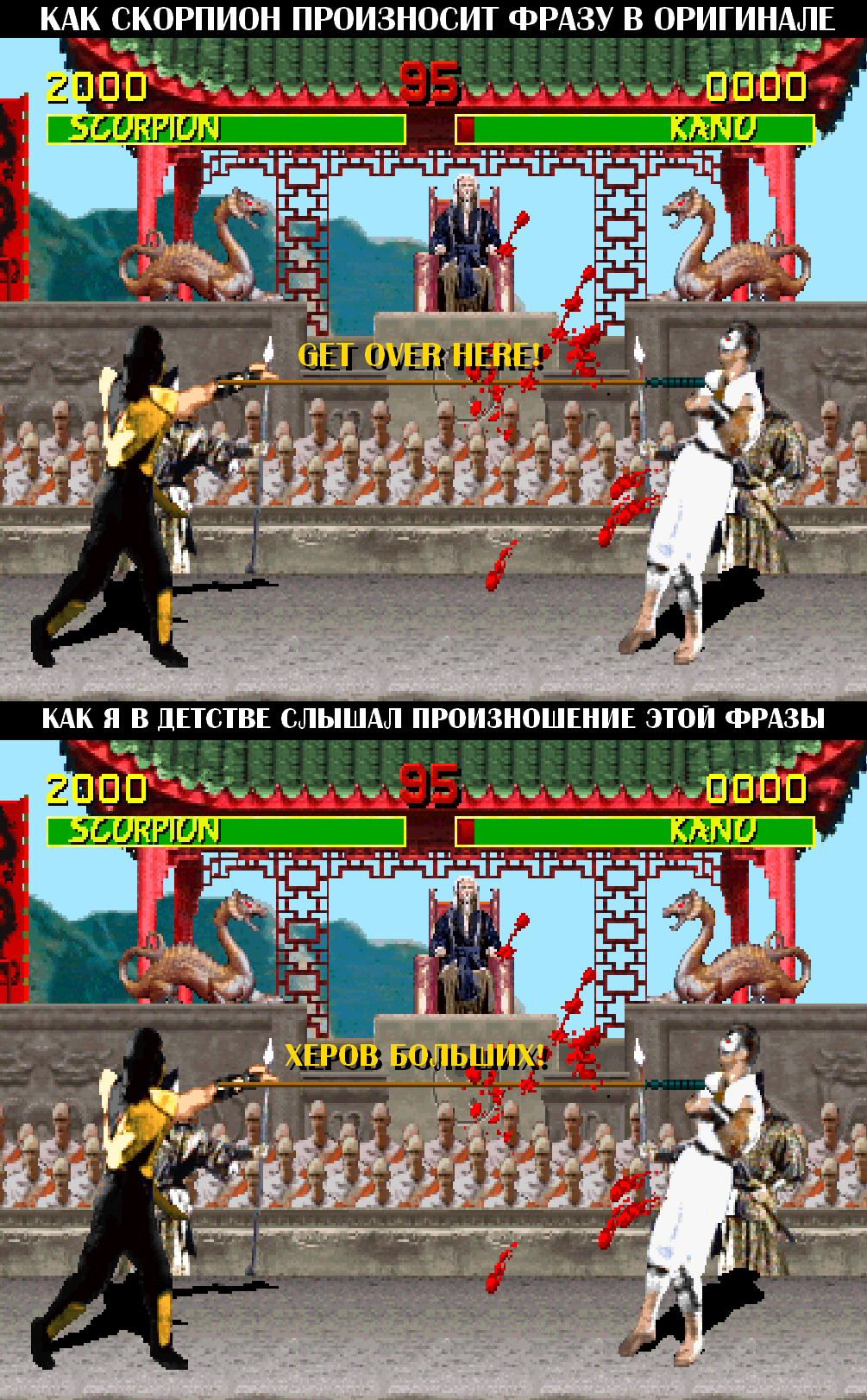 Художника каждый может обидеть! Только у тебя тонкое чувство юмора, а у всех остальных оно атрофированное. Или может быть твой юмор не для всех? Ну давай разберём, что ты тут пытался пошутить. Каким образом "Get over here" может слышится "Херов больших"? Тут как бы вся шутка про "слышится не то" идёт по звезде, т.к. ничего общего даже нет. Смеяться над полной заменой слов, серьёзно? Как минимум "хер" должен быть последним словом, но с остальными что делать, чтобы хоть улыбнуло? Можно погуглить "песни в которых не то слышится", чтобы понять насколько ты мимо кассы.