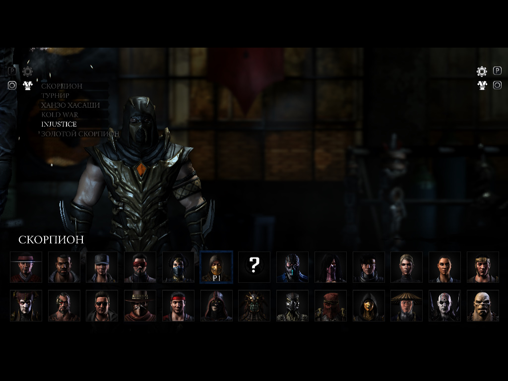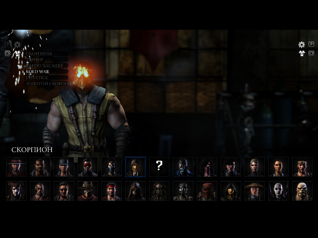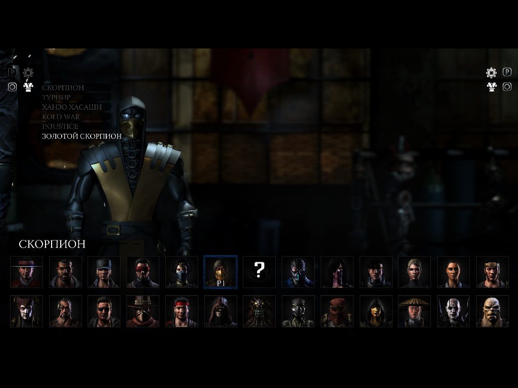 Тут все костюмы которые даются за приложение на телефоне и 2 костюма скорпиона